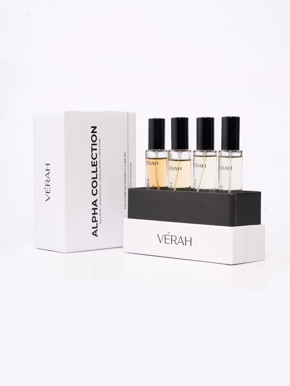 A curated set of bold masculine scents in 15ml bottles, perfect for discovering your signature fragrance. The Alpha Collection features Velvet Ember, Bourbon Smoke, Silhoutte Dawn, and Aqua Etoile, a blend of intensity, freshness, and depth in four distinct expressions.